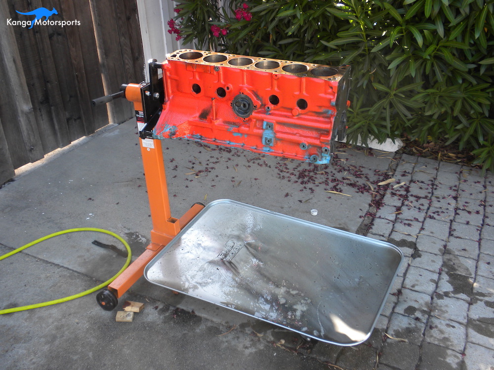 My block was filthy having sat abandoned in someones garage for what looked like several years. First thing to do is clean the block removing any grit, gasket residue, grease or oil build up. You can do that with a degreaser, water and scrubbing brushes. However, cast iron can quickly develop surface rust especially without a protective oil layer and when exposed to water.