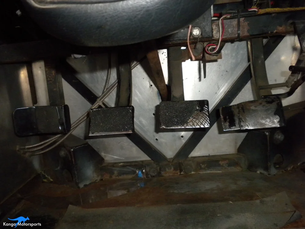 The three pedals and dead pedal are all mounted hanging above the drivers feet on square tubing.
